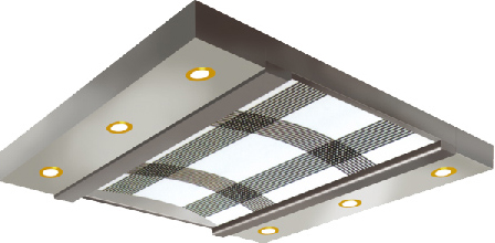 中部是影像拱顶,两侧为不绣钢底板上铺以筒灯的柔光照明设计。